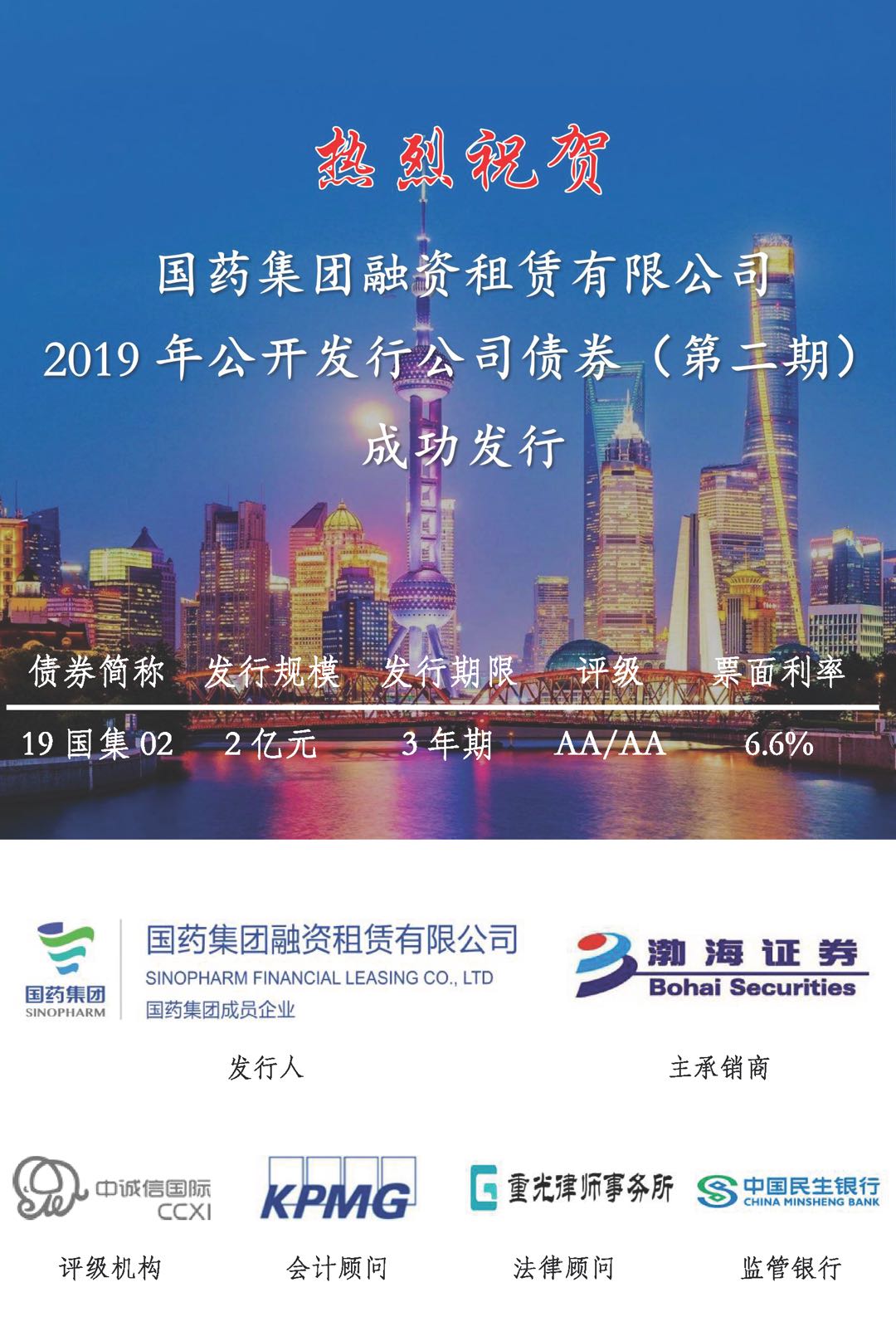 熱烈祝賀國藥租賃2019年公司債券(第二期)成功發行