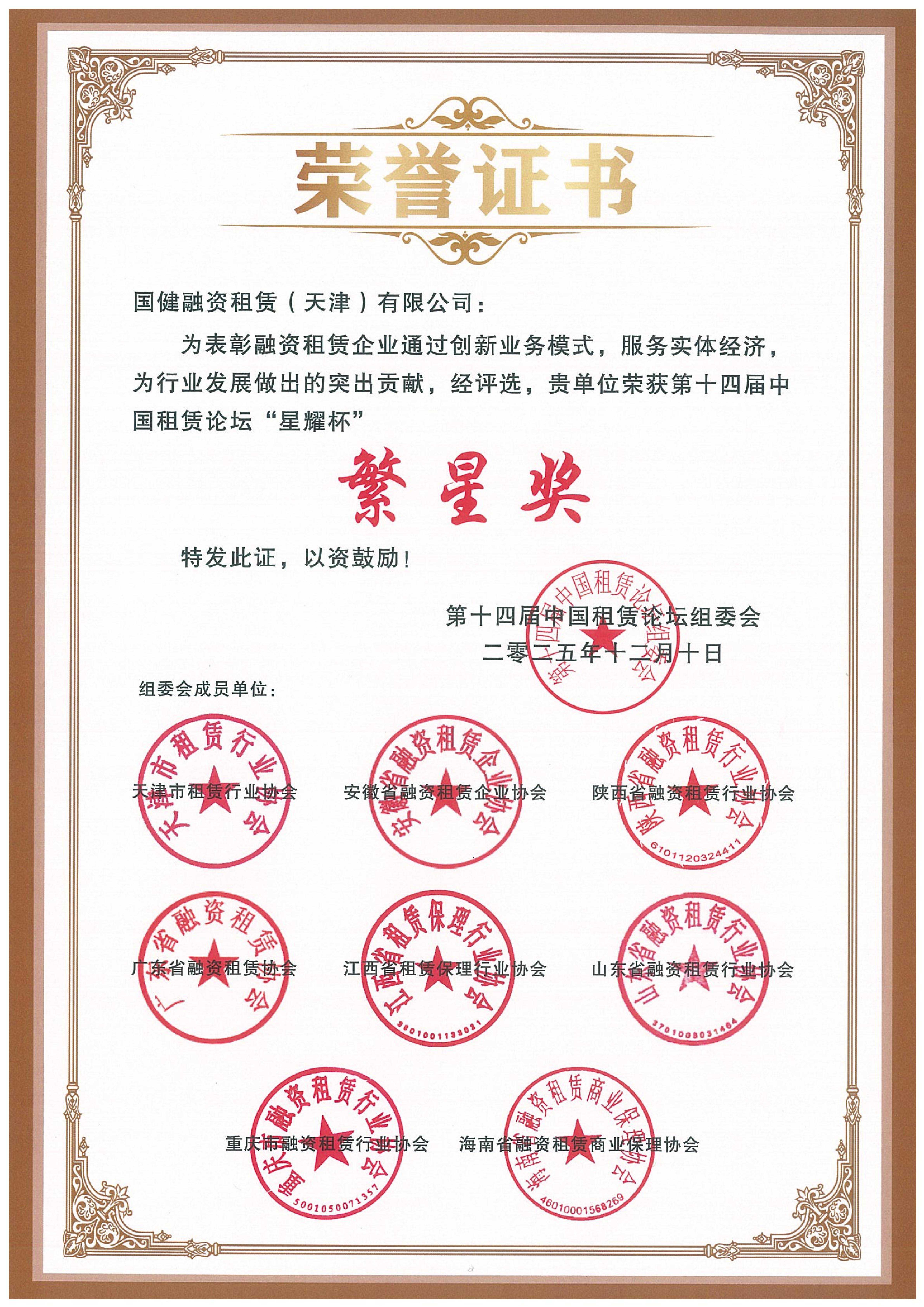 國健租賃天津子公司榮獲第十四屆中國租賃論壇“星耀杯”年度繁星獎