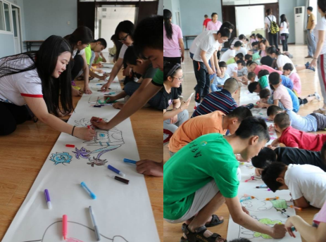在與孩子們共同完成的“百米畫卷”活動中,随著公司愛心人士精心繪制的卡通簡筆畫卷徐徐展開,現場歡呼聲一片。孩子們在老師和志願者們的引導下,和他們一起拿起手中的彩筆,尋找到喜歡的形象後飛快地塗抹上色,專注極瞭。起初,有些孩子還帶點怯懦,慢慢地,在志願者的鼓勵和帶動下也嘗試瞭起來,畫得越來越投入,和身邊的志願者們不再陌生,展開瞭天真的笑臉,有的孩子不但作瞭自我介紹還在畫卷上寫下瞭名字,還有的孩子作畫意願被極大地激發,甚至主動要求多次換筆調色。就這樣,黑白卷軸在小小畫筆的共同點綴下,一點點變得多彩和豐滿,就像是載滿瞭星星孩子們彩色的夢!活動最後,每位志願者還爲孩子們送上瞭一份精心準備的 畫筆和圖冊。